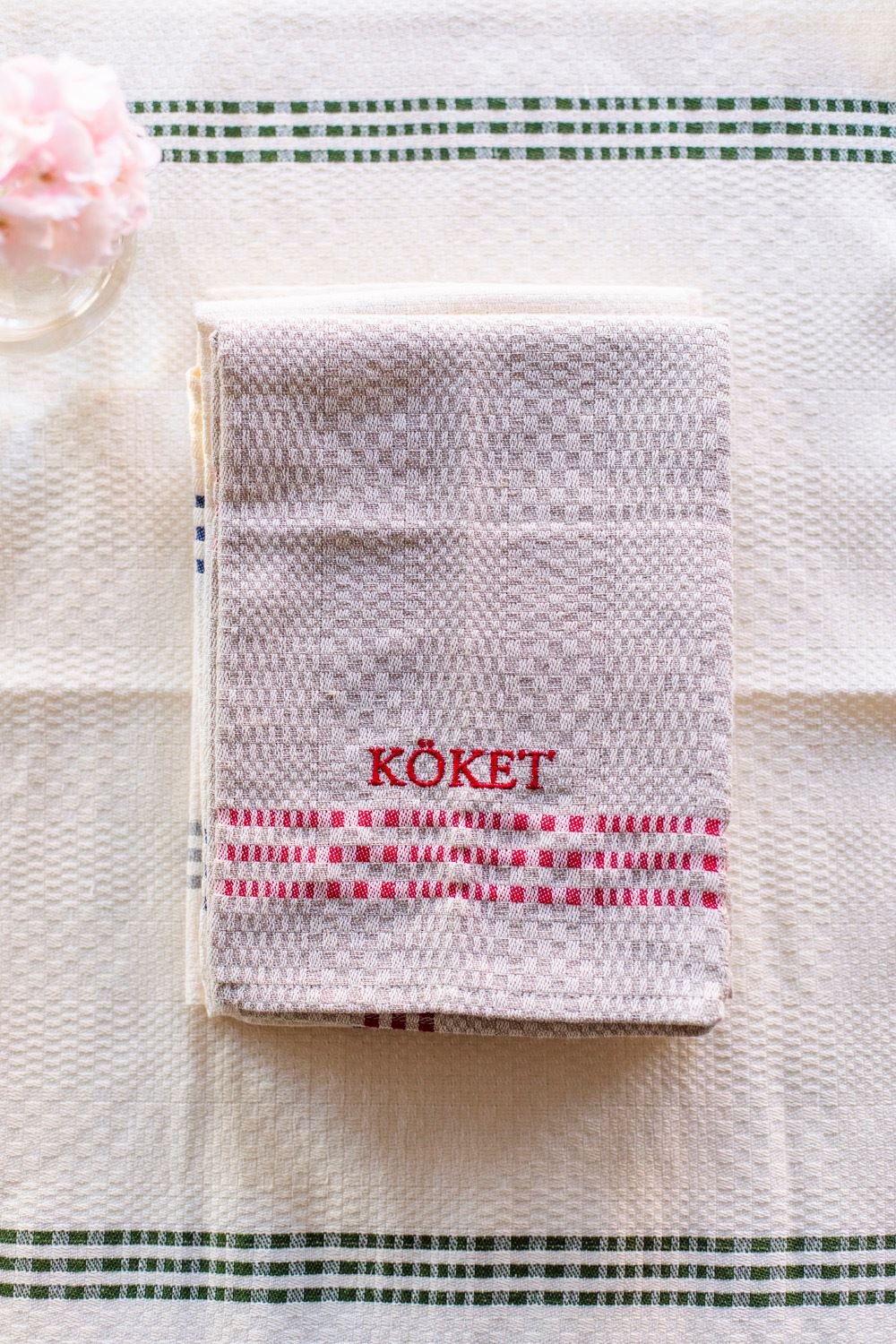Classic kitchen tea towel in linen and cotton. The towel is hemmed and comes with a hanger. Comes with KÖKET embroided in matching red.