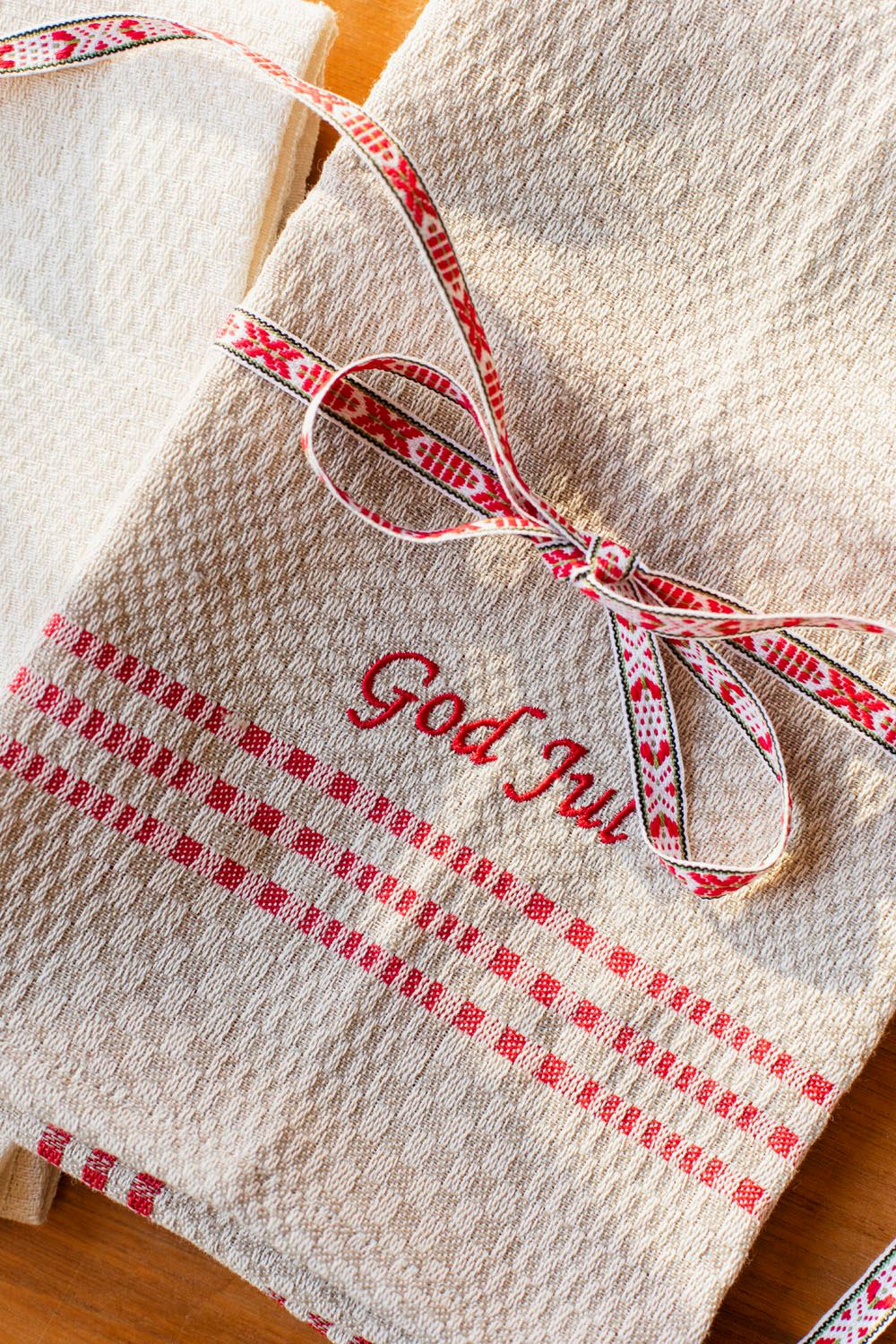 Tea Towel, Daladräll, White-red, embroidery GOD JUL