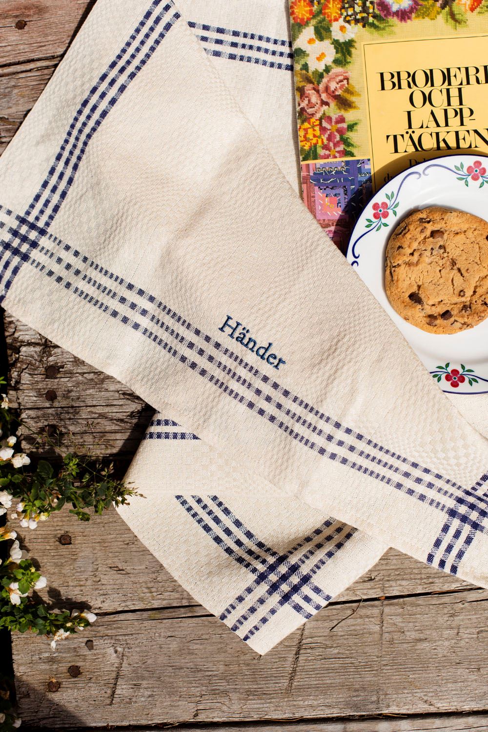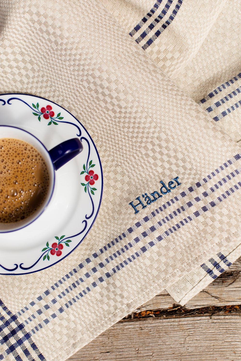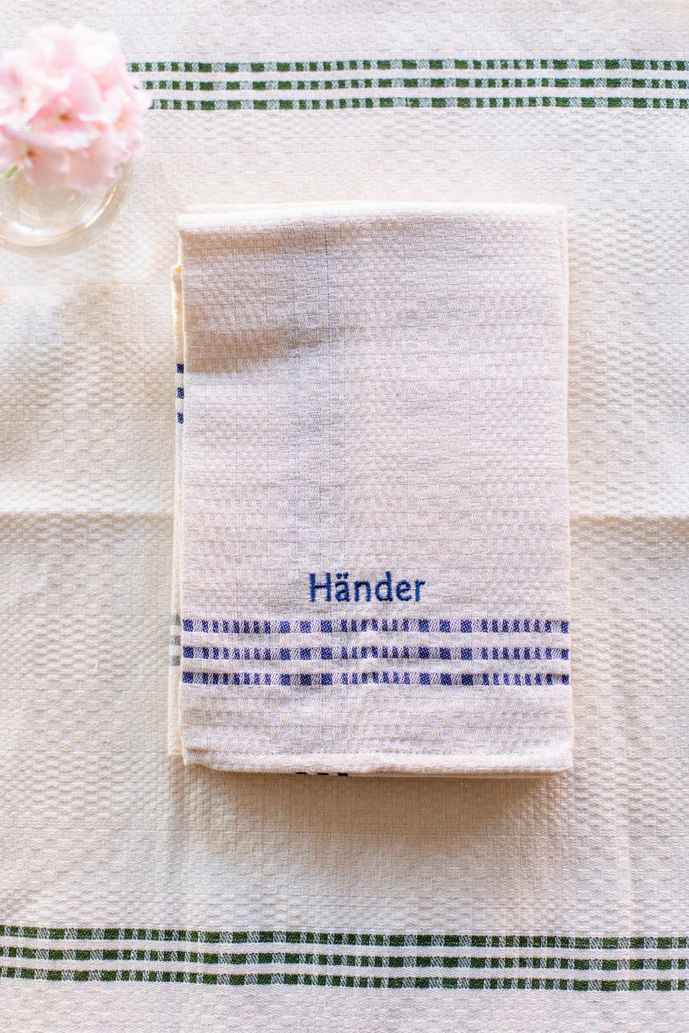 Klassisk kökshandduk av lin och bomull. Handduken är fållad och kommer med hängare. Brodyr med HÄNDER i matchande färg.