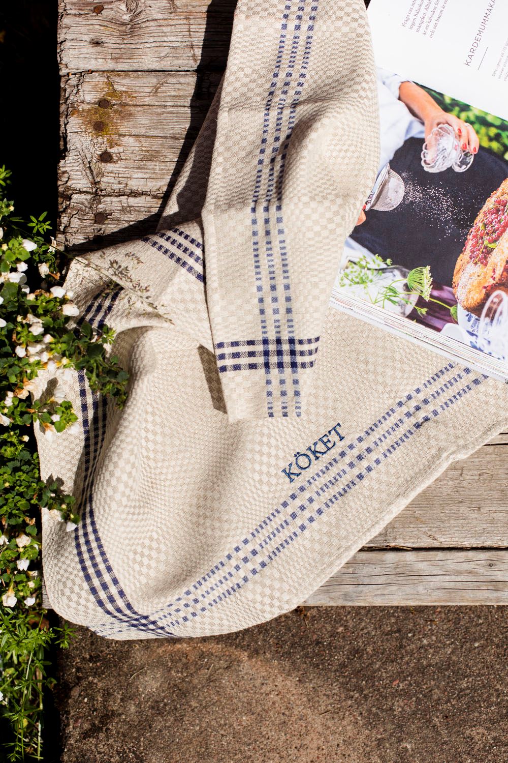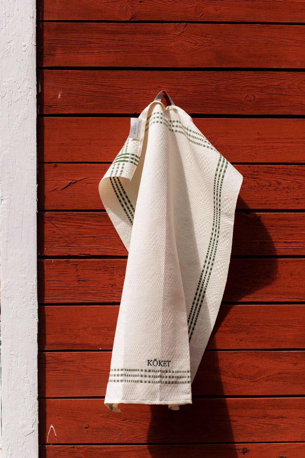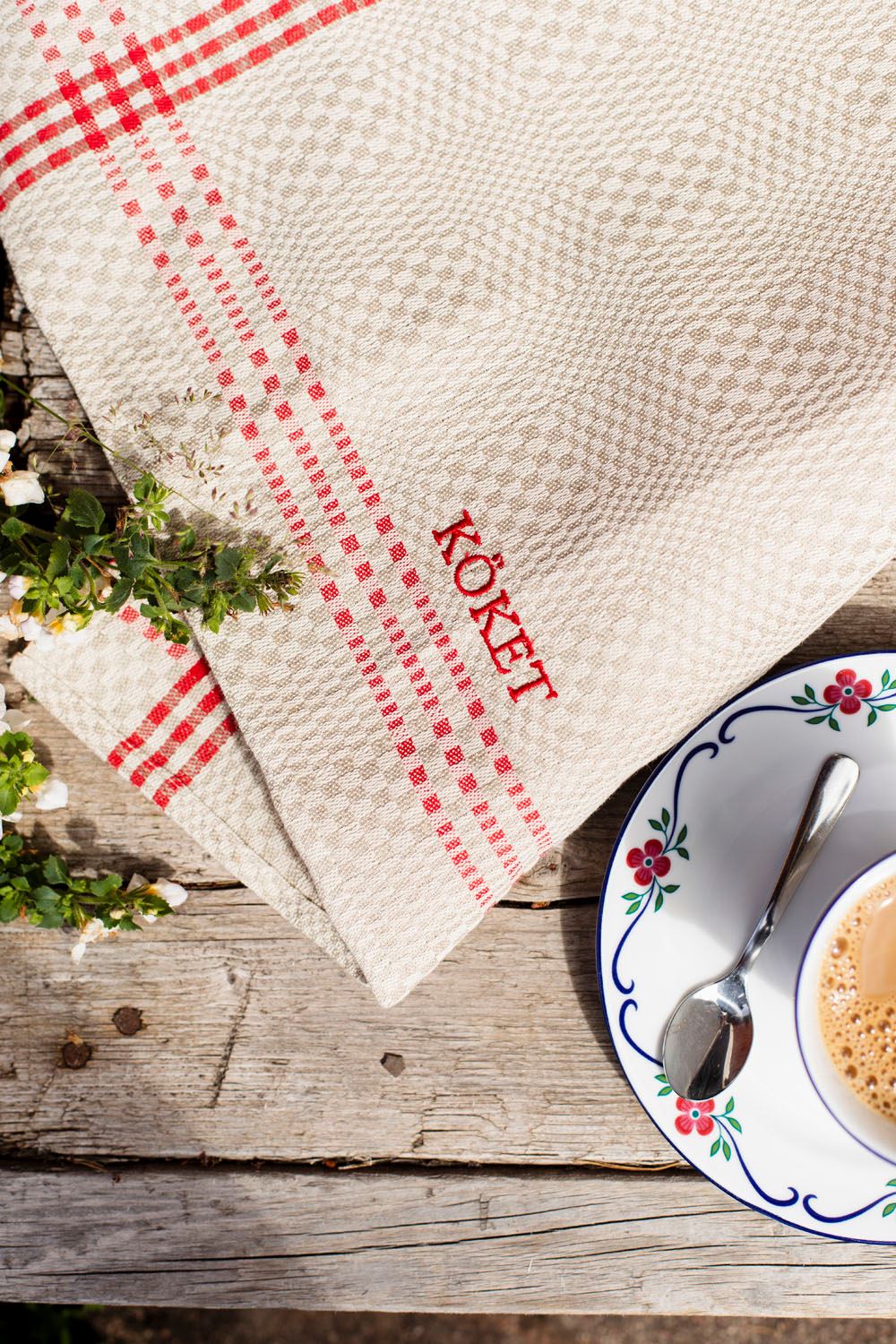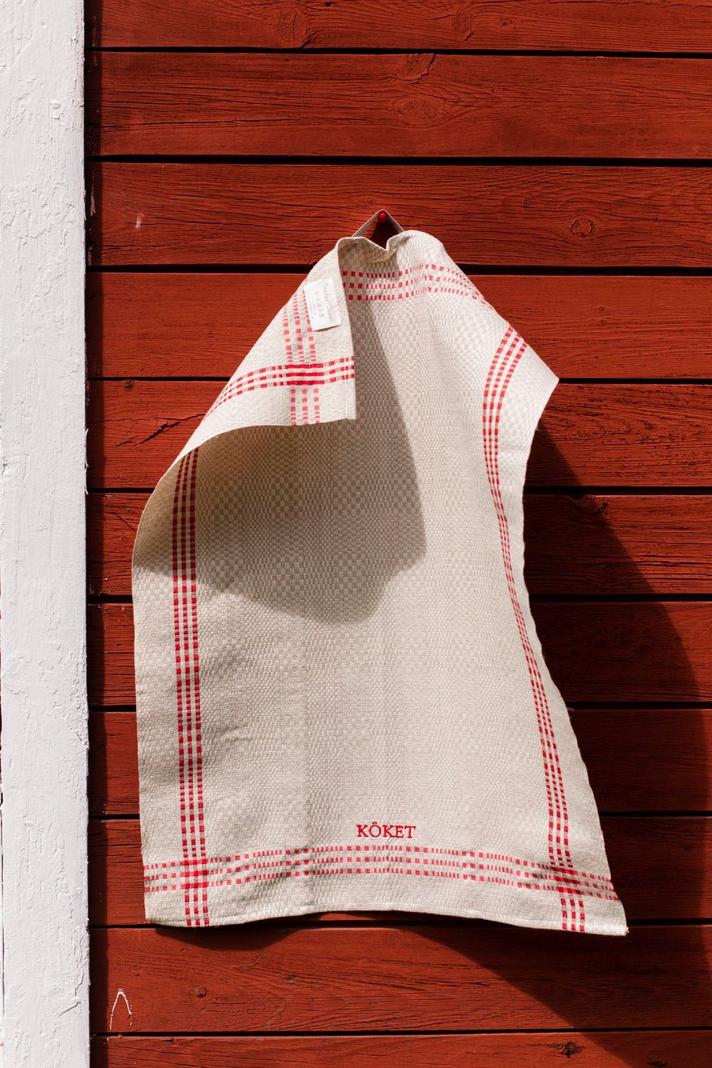 Klassisk kökshandduk av lin och bomull. Handduken är fållad och kommer med hängare. Brodyr med KÖKET i matchande färg.